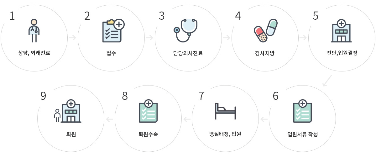 입원상담 → 접수 → 담당의사 진료 후 → 입원결정 → 원무과 → 입원수속 → 병실안내